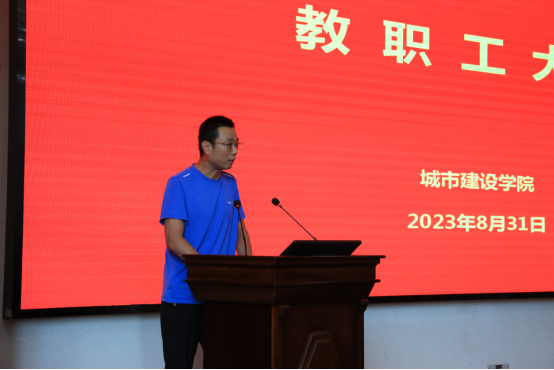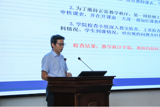 黄向阳副经理围绕近期教学工作,指出本学期要重点推进一流团队建设、加强员工尤其是大一新生专业认知教育,不断引导员工提高创业创新精神,增强实践能力,同时进一步推动与省内外高校的科研教育合作。黄经理还强调全体教职工要不断加强师德师风学习,做一名合格的大学教师。