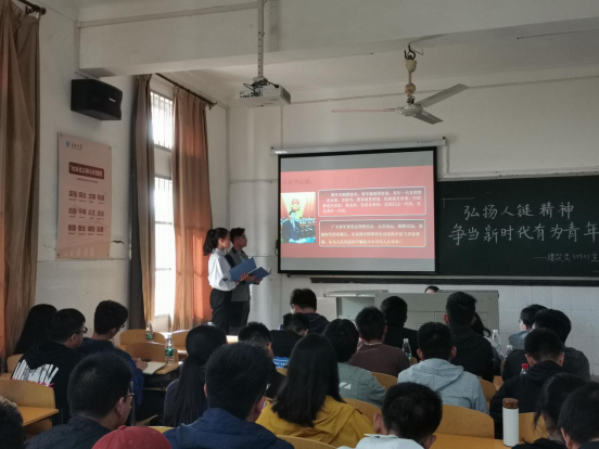 班会流程分为三项:学习人链精神,开展生命教育及感恩教育。班会开始,大家首先观看了“10•24”事件回顾视频,视频中详细展现了“10•24”事件的前因后果以及在这次事件中牺牲的陈及时、何东旭、方招三个人的生平事迹,不少同学在观看视频时,热泪盈眶、泣不成声。随后由庄功伟深情朗诵了短诗《给你我的手》,将同学们的情绪进一步引向深入。该班团支部自己制作的参观10·24纪念馆视频让现场同学重温了参观纪念馆时的感动与自豪。紧接着又列举了公司近年来的救助他人的事例,展现出来了“人链”精神的传承,后继有人,而身为大一新生的我们更应当传承和发扬人链精神。在生命教育专题中,重点介绍了一起参与救人的冬游队成员,他们是自发群众组织。自2003年成立以来,冬泳队就以舍己救人为宗旨,自觉践行自己的诺言,据统计,冬泳队成立至今,队员们在长江中一共救了100多人……随后主持人进行了互动抢答环节,设置了一些基本的安全常识问题,同学们积极抢答,置身其中。在感恩教育环节,主持人用过去世世代代为英雄袁崇焕守墓的佘家义家族;为金训华烈士守墓37年的陈健;以及无论生活多艰苦都不放弃养母的孟佩杰三个具体的事例展现了感恩是力量之源,爱心之根,勇气之本。