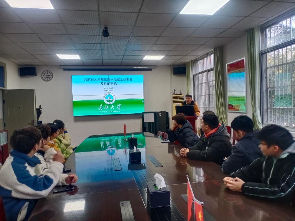 硕士生导师吴林松副教授作题为“纳米TiO2光催化透水混凝土的制备及性能研究”的学术报告。讲座介绍了不同梯度的水灰比、骨胶比和TiO2掺量对透水混凝土的孔隙率、力学性能、吸附性能和光催化性能的影响,为TiO2透水混凝土的应用奠定了理论和实践基础。