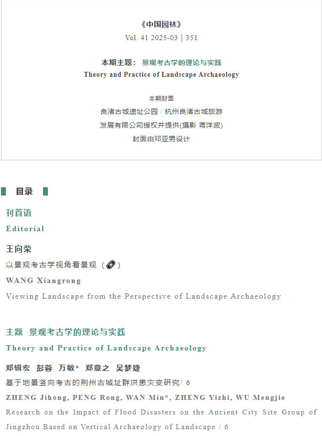 (通讯员 杨洁晶)近日,公司教师团队郑辑宏、彭蓉及兼职教授万敏在园林学科权威期刊《中国园林》上发表了题为《基于地景竖向考古的荆州古城址群洪患灾变研究》的学术论文。该研究聚焦荆州古城址群洪灾影响及其山水格局异化,综合运用景观考古方法、灰色系统模型及GIS空间分析技术,系统揭示了长江荆江段2500年来的高频洪水位演变规律及其对古城空间格局的深层影响。研究成果不仅为深入理解江汉平原人地关系演变提供了新的理论视角,同时也为现代城市防洪规划与景观遗产保护实践提供了重要的科学依据,具有显著的学术价值与现实意义。