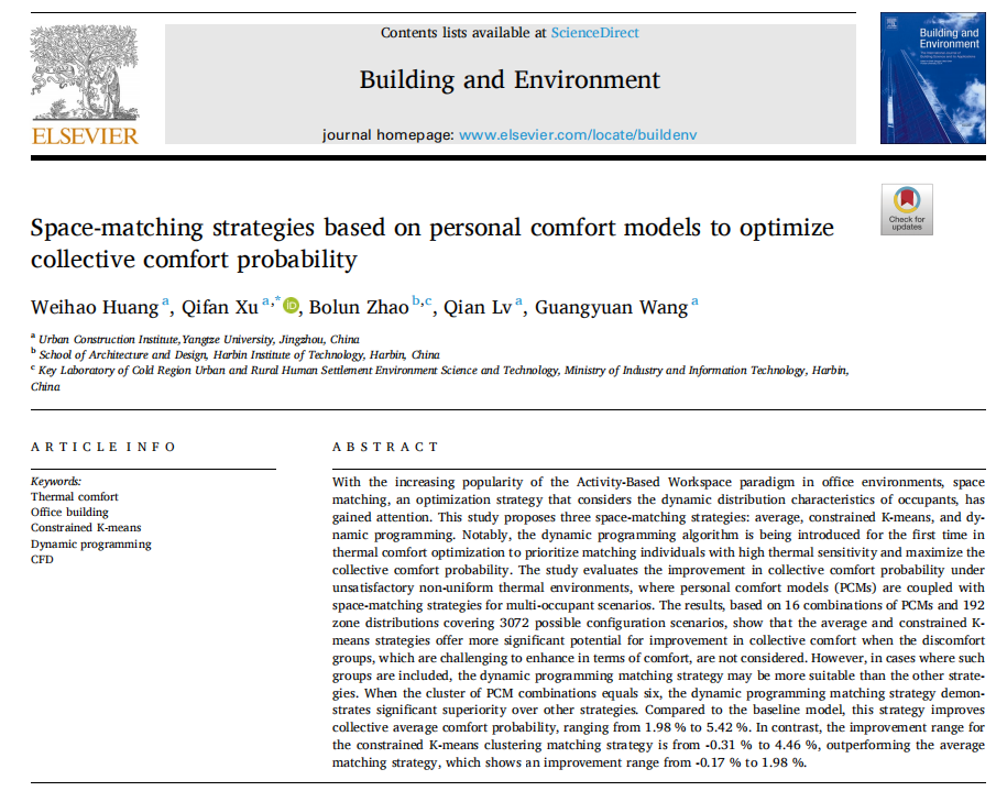 (通讯员 杨洁晶)近日,我院城市建设学院硕士生黄炜皓作为第一作者,在中科院工程技术大类一区Top期刊《Building and Environment》 (5年IF=7.2)发表题为“Space-matching strategies based on personal comfort models to optimize collective comfort probability”的研究论文,首次提出动态规划算法在建筑热舒适优化中的应用,为多人员办公环境下的集体舒适度提升提供了创新解决方案。