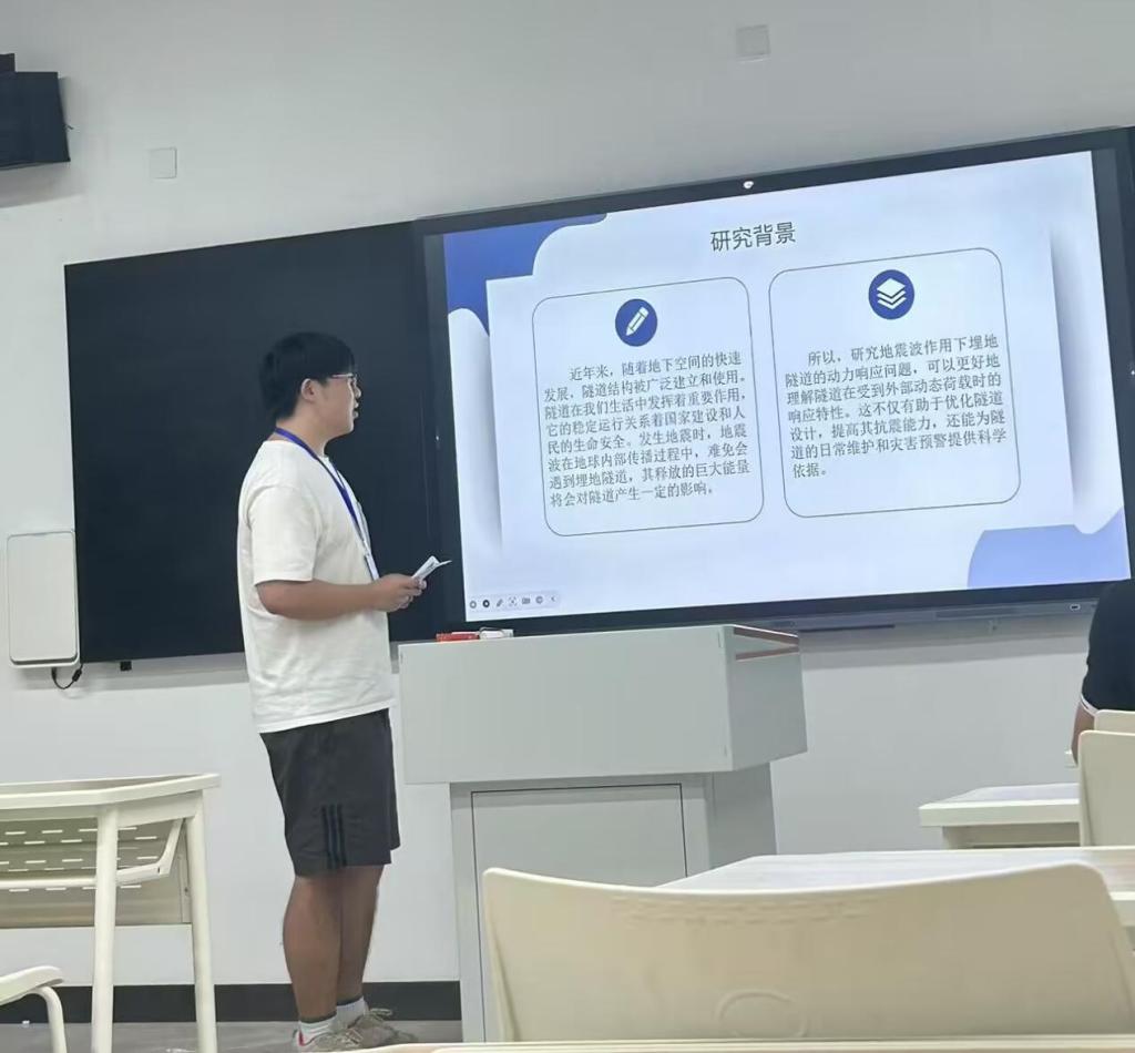 公司2023级研究生孙睿哲在论坛中以“SV波和P波作用下隧道动力响应特征研究”为主题进行了汇报,内容主要聚焦于结合 FLAC3D 与 MATLAB 软件,研究地震波斜入射下隧道动应力响应的分析方法。通过理论软件结合揭示不同地震动参数下SV波和P波的传播规律及其对地下隧道的动力响应机制,旨在准确评估地震荷载对隧道结构的损伤效应,同时为提升城市地下空间抗震能力提供理论支撑与技术参考。