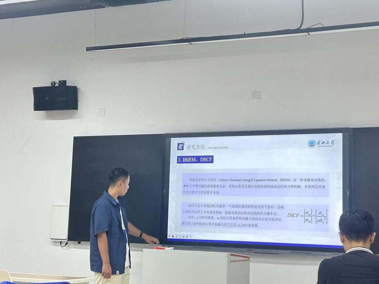 公司2023级研究生易舜在论坛中以“SH波作用下城门洞形隧道动力响应分析”为主题进行了汇报,内容主要以全空间中的深埋城门洞形隧道为研究对象,以间接边界积分方程法(IBIEM)和弹性波动理论为基础,对在平面SH波作用下的城门洞形隧道的动力响应问题展开研究,旨在更好地理解隧道在受到外部动态荷载时的响应特性。这不仅有助于优化隧道设计,提高其抗震能力,还能为隧道的日常维护和灾害预警提供科学依据。