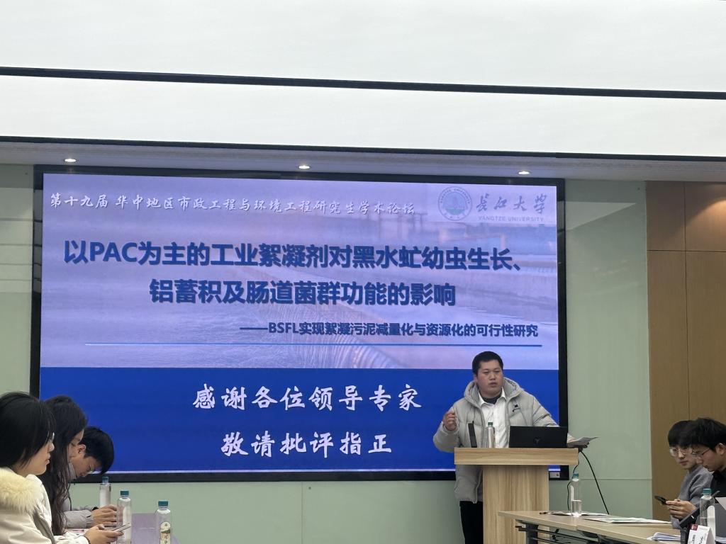 2024级研究生肖彦作题为“以PAC为主的工业絮凝剂对黑水虻幼虫生长、铝蓄积及肠道菌群功能的影响”的学术汇报,从“机制-工艺-风险”视角评估絮凝剂残留的生态安全性,为黑水虻参与市政污泥资源化利用过程的风险控制提供科学依据。