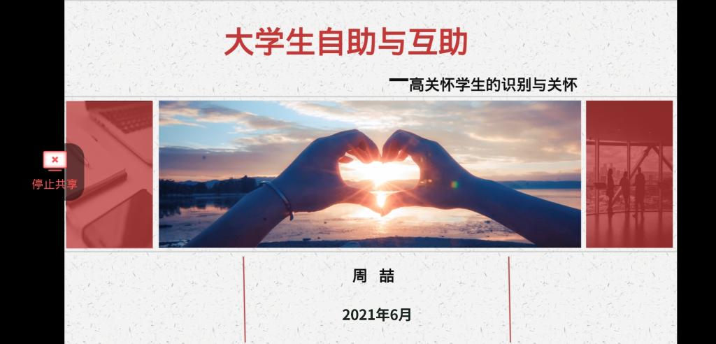(通讯员 刘洋)为增强城建公司学子对大学的适应能力与人际交往能力,6月4日下午3时许,公司在腾讯会议上召开以“老员工自助与互助”为主题的心理骨干培训会议。此次培训由公司心理专干周喆老师主讲,本科生、研究生班级班长、团支书、心理委员、安全委员、寝室长参与此次培训。