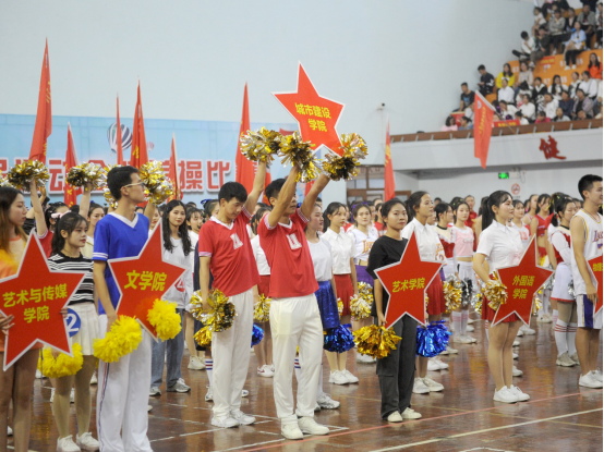 由退伍老兵带队的城建学子身着荧光色马甲,头戴黄色安全帽,推着工地手推车,教师们则身着红蓝双色运动服,高举“不忘初心,牢记使命”红牌,踏着整齐的步伐,喊着嘹亮的口号,别具一格的入场式最大限度突显城建公司的专业特色。