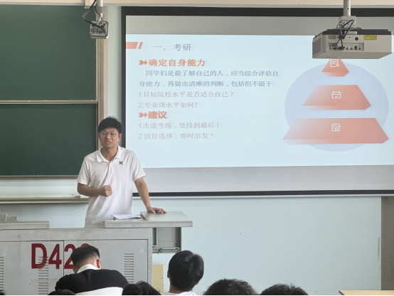 会上,就业专干杜琛向2025届毕业生详细介绍了公司近几年的考研就业情况,分析研判了2025届毕业生的就业形势。他表示无论是考公还是考研,同学们要树立目标、合理规划、逐步落实,以坚定地信念、踏实的态度、有效的行动去复习备考。对于当前求职找工作的员工,他建议同学们要把握住校招机会,及时关注校园招聘信息,积极主动投递简历,在招聘面试中不断积累经验,总结不足,以实战来提高自己的核心竞争力。