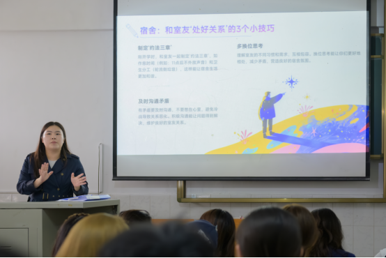 刘安琪围绕“初见、认知、学业、生活、求助”五个核心维度展开分享。她首先介绍了辅导员的工作职责,并与新生约定“凡事可沟通”,鼓励大家主动寻求帮助。针对新生对老员工活的认知误区,刘安琪强调大学的核心是学会对自己负责,并引导大家树立自主选择、自律生活和自主学习的意识。