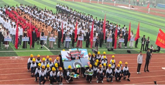 开幕式上,城建公司方阵同学身着统一服装,头戴黄色安全帽,手持建筑模型,迈着整齐有力的步伐走过主席台。
